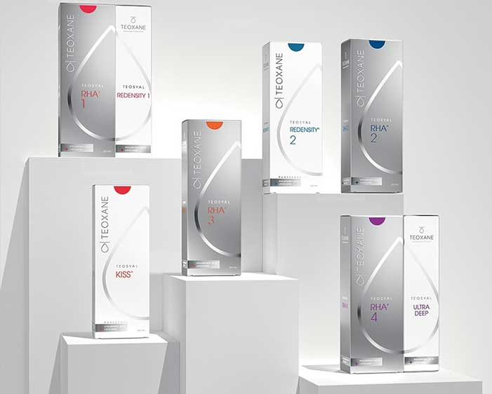 In meiner Praxis arbeite ich mit den hochqualitativen Dermafillern von Teoxane Laboratieres, deren Produkte patentiert sind mit unterschiedlichen Geldichten, die genau auf die Behandlung verschiedener Gesichtsbereiche abgestimmt sind.